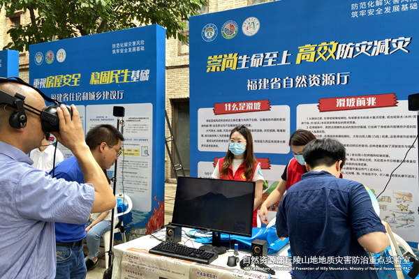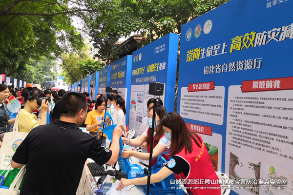 在“防灾减灾应急知识集市”中,地灾重点实验室联合有关单位精心布置“地质灾害科普宣传”主题展位,为现场群众提供“福建省典型地质灾害防治VR”、“地质遗迹景观演化VR”现场体验和地灾相关知识咨询解答服务,并分发宣传册和纪念品300余套,过往群众积极参与互动,反响热烈。