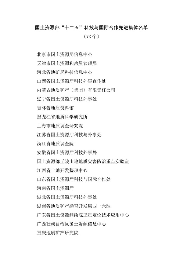 国土资源部“十二五”科技与国际合作先进集体名单(部分