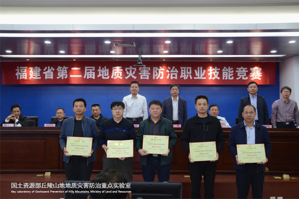 竞赛分为野外实操考核及室内理论考试两大部分,综合测试参赛选手的地质灾害防治专业技术水平。在福州市连江县贵安典型地质灾害点,选手们施展十八般武艺,观岩性、量产状、详记录,现场编制地质灾害应急调查报告及防治措施方案;在室内考场,选手们认真审题,严谨作答,运用扎实的地灾防治评估、勘查、设计、施工、应急知识及相关的水文、地质、岩土知识,针对实际案例展开分析评述。经福州大学岩土工程与工程地质研究所所长简文彬教授为组长的专家评委组严格把关评审,最终福建省闽西地质大队王小平摘得个人奖桂冠,重点实验室岩土所赖鹏晖获个人第三佳绩,福建省地质工程勘察院勇夺团体奖第一名,福建省厦门地质工程勘察院获组织奖。颁奖仪式上,福建省总工会机械化工矿冶工会工委主任王华,共青团福建省委常委陈文伟,省地矿局领导倪超、郑荣富、周珍琦、吴晓明、韩康平、吴有胜、黄文兵为获奖选手和团体代表颁奖。