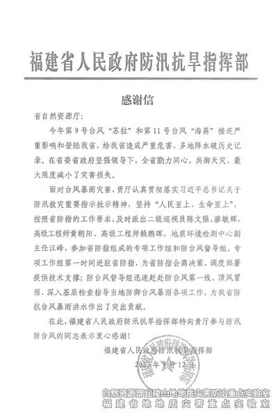 近日,福建省人民政府防汛抗旱指挥部向省自然资源厅致信,对其在台风“苏拉”及“海葵”期间开展的地质灾害防治技术支撑、巡查指导等工作予以肯定和感谢,其中1名专家系地质灾害重点实验室副主任赖鹏晖。