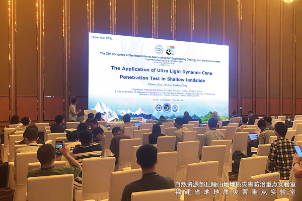 本届大会主题为“工程地质与宜居地球”,围绕工程地质与全球气候变化、地质灾害评估与防治、岩土体结构与工程地质特性等议题展开交流研讨。在地质灾害分会场,地灾重点实验室郭朝旭博士作了题为《The Application of Ultra Light Dynamic Cone Penetration Test in Shallow landslide》(超轻型动力触探试验在浅层滑坡中的应用)的学术报告。他详细介绍了在武平等地浅层滑坡地灾点开展基于超轻型动力触探技术的土壤特性试验的具体过程、结论与技术应用前景,为降雨型浅层滑坡机理研究提供了新的思路与方法。